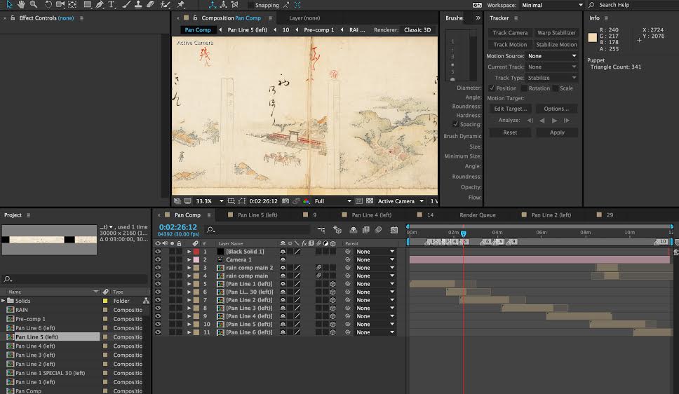 I placed all 18 images on a digital canvas and positioned a camera facing the images. The images were arranged seamlessly from right to left so that all of their left edges were flush against the next image in the sequence.
